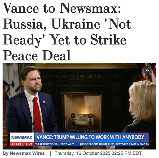 «Вэнс заявил, что Москва преувеличивает свои успехи на фронте, что затруднило достижение соглашения в последние несколько месяцев, хотя определенный прогресс был достигнут. «Я думаю, что существует фундаментальное несоответствие ожиданий: россияне склонны думать, что они действуют на поле боя лучше, чем есть на самом деле», — сказал он».