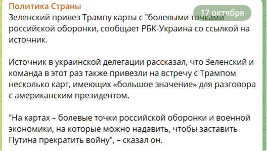 И, как мы уже писали, вполне возможно, что и заявления Трампа о прогрессе в переговорах с Путиным связаны не столько с реальными ожиданиями такого процесса, сколько с желанием президента США, уйти от темы Томагавков, после того как он убедился, что их удары Путина пойти на остановку войны не побудят, а к резкой эскалации привести могут.»