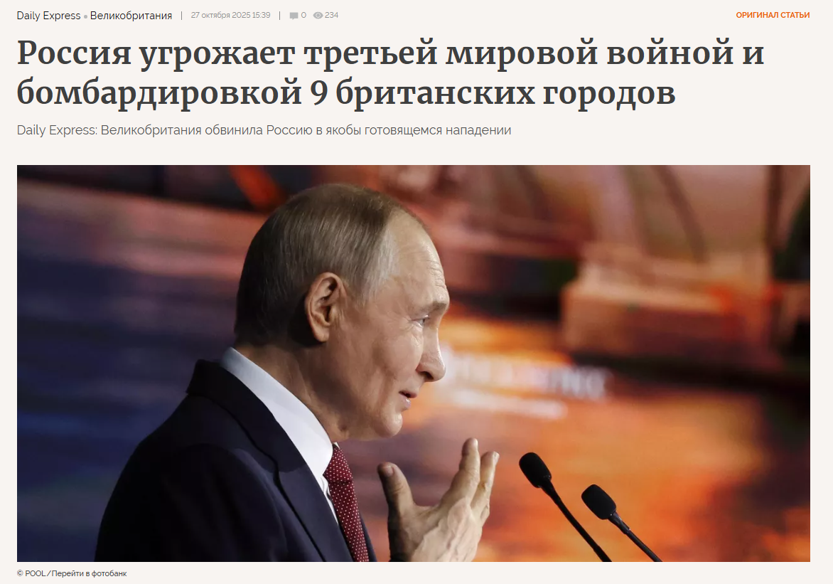 Источник сообщил: "В переданной информации приводятся подробности о нанесении ударов как с большой, так и с малой высоты. Авиаудары России по территории Великобритании, безусловно, стали бы объявлением войны как Великобритании, так и остальным странам НАТО" (эти обвинения ничем не подтверждаются — прим. ИноСМИ).