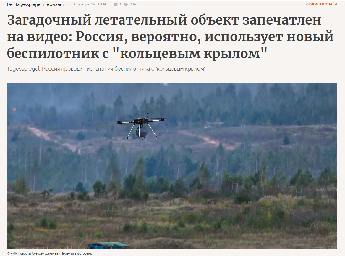 Россия проводит испытания ранее неизвестного типа БПЛА с "кольцевым крылом", пишет Tagesspiegel. Преимущества такого дрона заключаются в улучшенных аэродинамических характеристиках, а также в повышенном уровне грузоподъемности и увеличенной дальности полета.