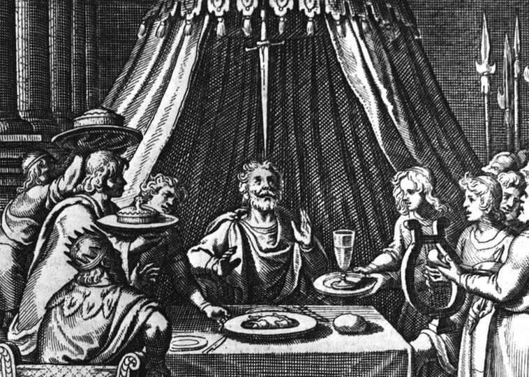 Либо политическим пересказом истории сиракузского тирана Дионисия Старшего (V в. до н. э.) с фаворитом Дамоклом, над которым повесили на конском волосе обнажённый меч в разгар весёлого пира.