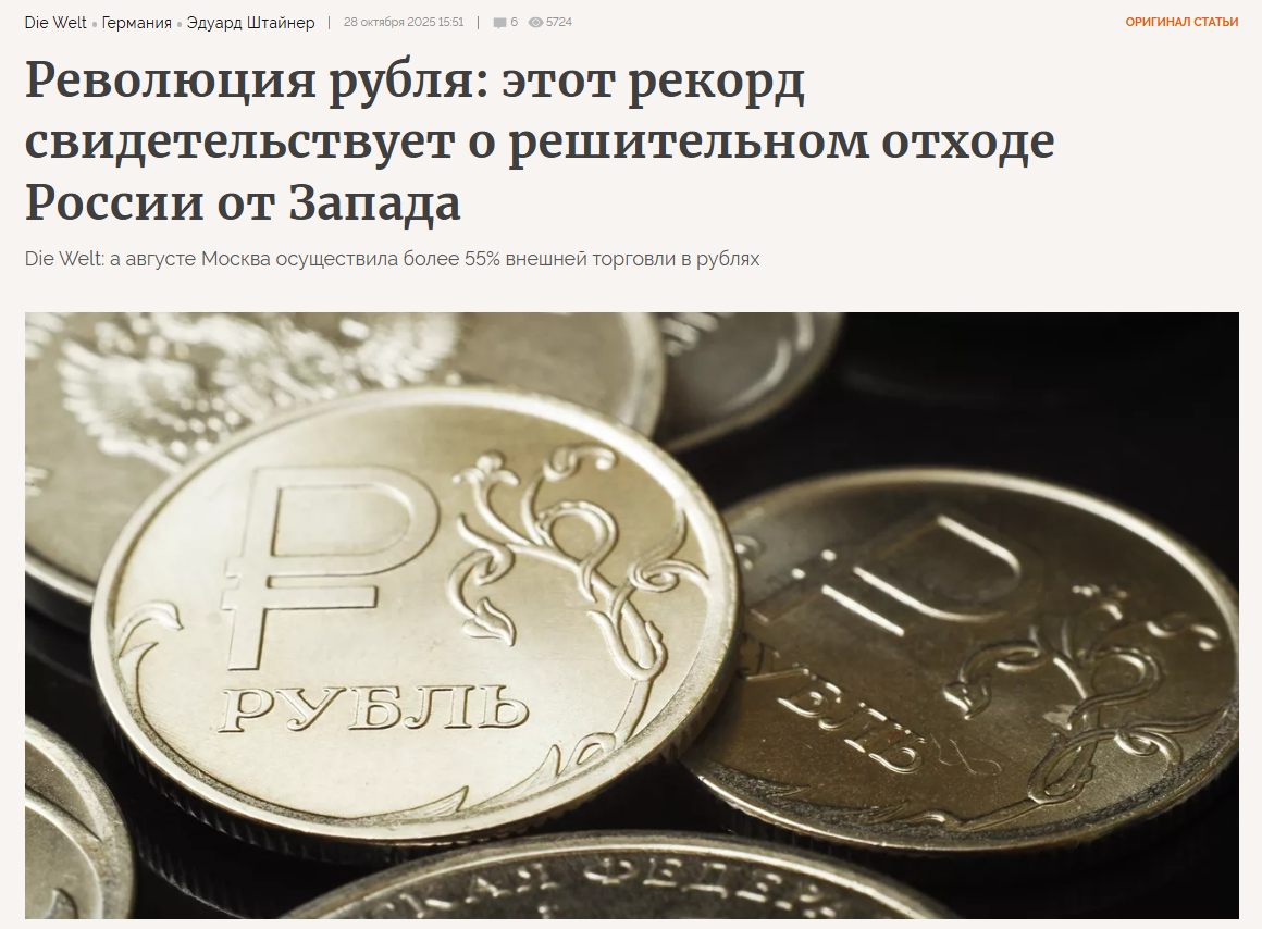 Процесс отказа России от доллара и евро набирает обороты, пишет Die Welt. В августе Москва вела более половины своей внешней торговли в рублях. Такое положение показывает Западу неэффективность санкций и побуждает его искать новую стратегию в отношении Кремля.