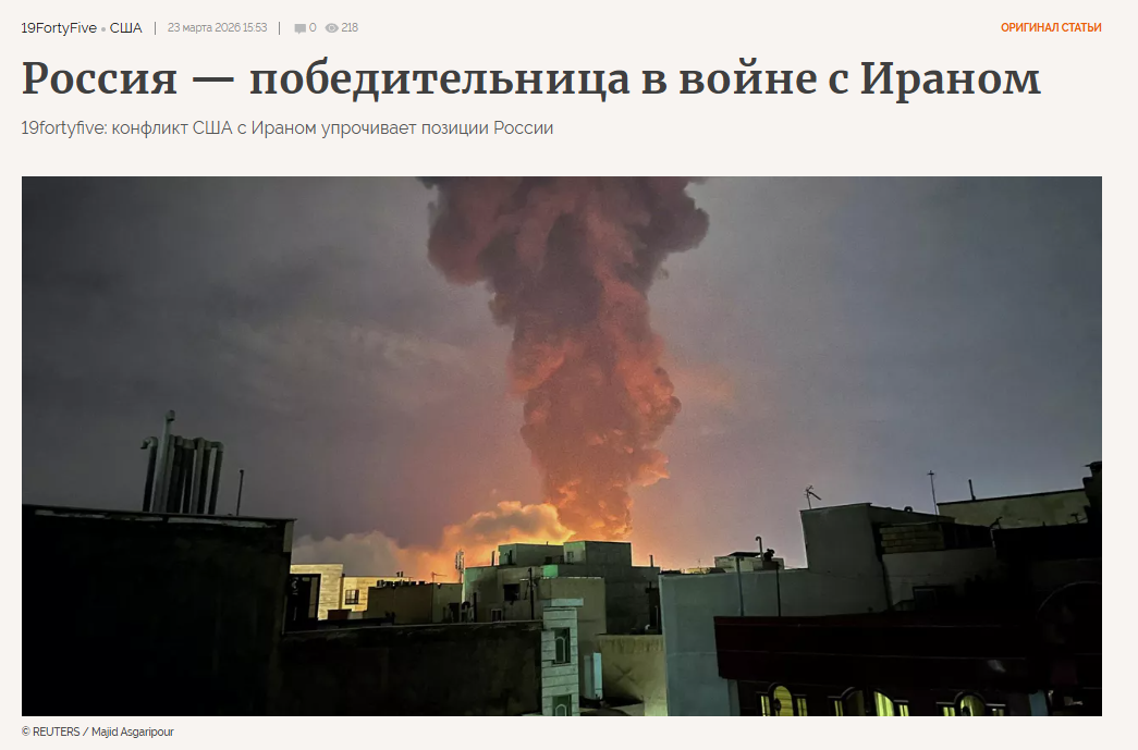 Чем дольше продолжается война Трампа против Ирана, тем сильнее становятся позиции России, пишет 19FortyFive. Москва возвращается на мировой рынок нефти и увеличивает доходы за счет усилившегося спроса, а Украина тем временем полностью утратила поддержку США.