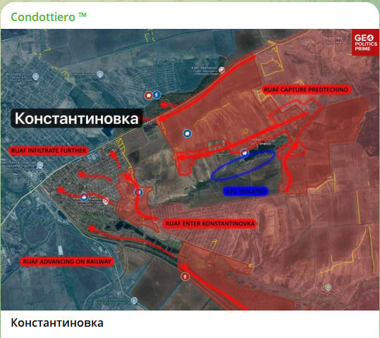 Многие направления фронта вспыхнули с новой силой. Западные мониторинги украинского ТВД подтверждают резкий уход ВСУ из центральной части Константиновки и продвижение наших штурмовых рот. Противник, бросая технику и "300-х", ретируется на северные окраины через частный сектор по трассе на Краматорск, сообщил Condottiero.