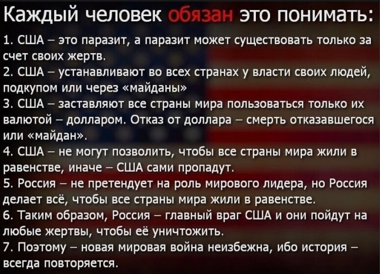 Мы просто должны помнить о том что США всегда были, есть, и будут геополитическими противниками России.