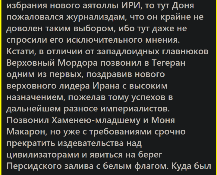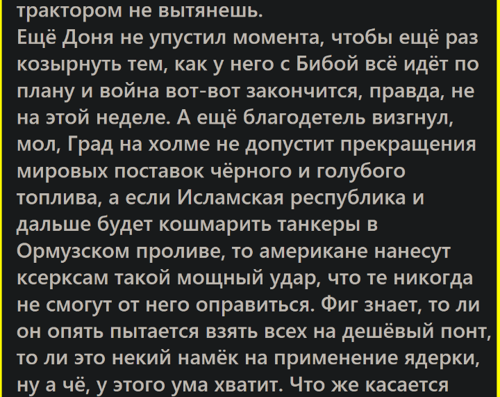 На фоне бессвязных вербальных интервенций Трампа, ищущего красивый предлог, чтобы свалить с Ближнего Востока (что предсказуемо), Иран ведёт себя крайне достойно – демонстрирует решимост...