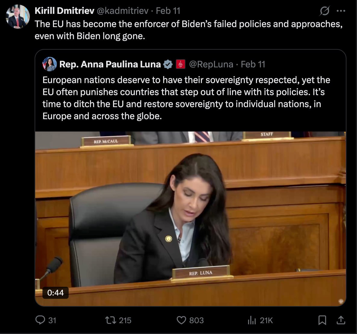 В этом цирке становится скучно. Если вчера мы слушали сказку про Байдена с Голубиным Государством, то теперь сюжет дополнен. Рыцарь-Трамп вот-вот устроит падшей и поруганной мигрантами Европе бело-христианскую реконкисту, к которой Россия (в лице Дмитриева) с радостью подключится.