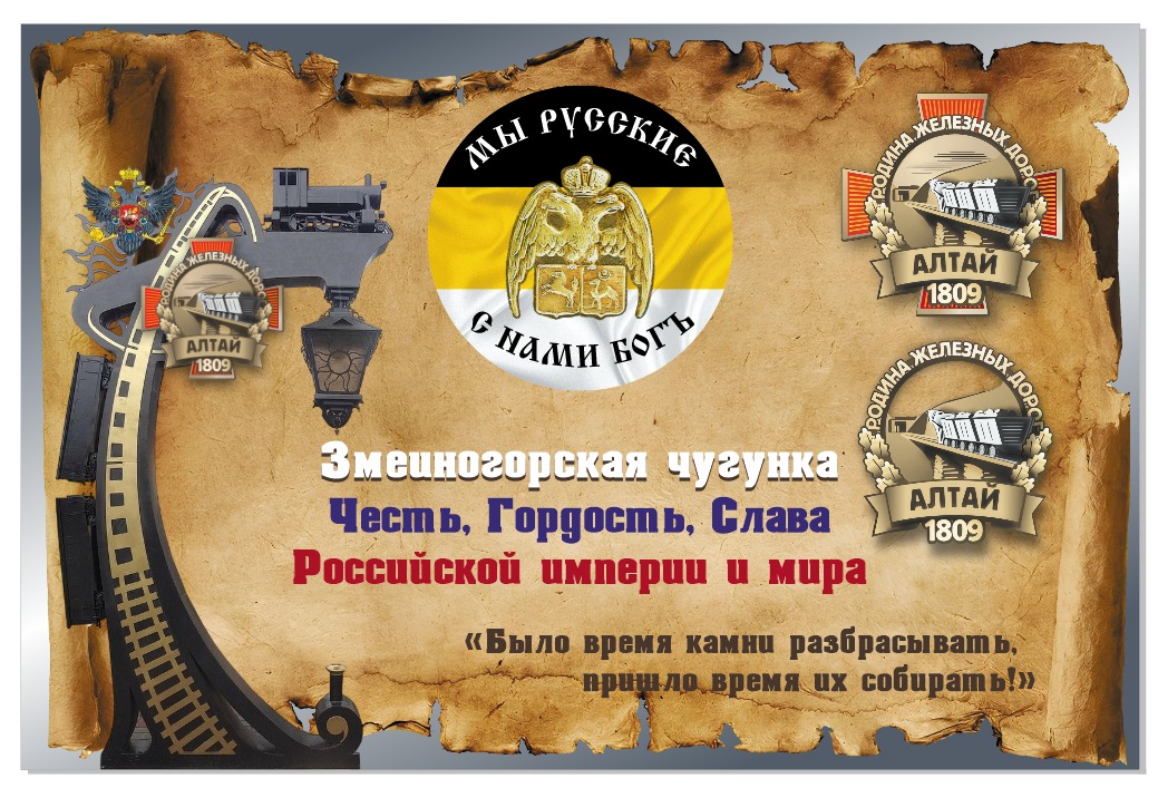 Текст «Змеиногорская чугунка честь гордость и слава Российской империи» выполнен на фоне триколора современной России, символизирующий преемственность царского периода времени и современной России.