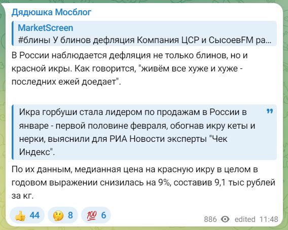 В 2026 году средняя стоимость набора продуктов для приготовления блинов по России снизилась на -4,7% — до 113,64 рубля. Таким образом в Россию, вместе с масленицей пришла блинная дефляция. Основной драйвер удешевления — падение цен на яйца (-20%) и сахар (-8,5%), цены остальных компонентов не превысил уровень инфляции.