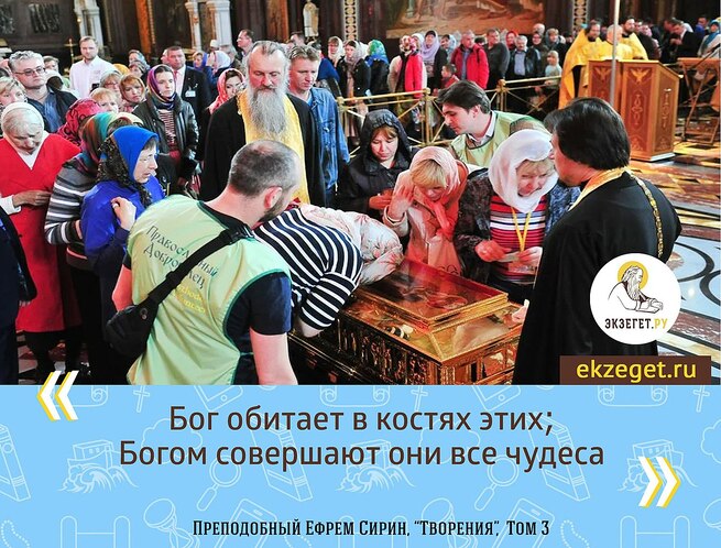 • Возьмем первые две цитаты. Владыка жизни обитает в мертвых костях??? У вас нет никакого странного чувства? Многократно говоривший, не сотвори себе кумира и не поклоняйся ему, обитает ли в костях мертвых которым кланяются? Дарующий жизнь сотворит ли обитель в мертвеце? Вот о Литургии хорошо сказано, по писанию. А поклонение костям мертвых это ужас!
