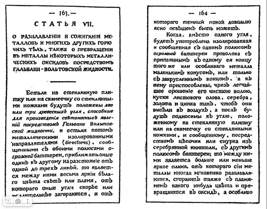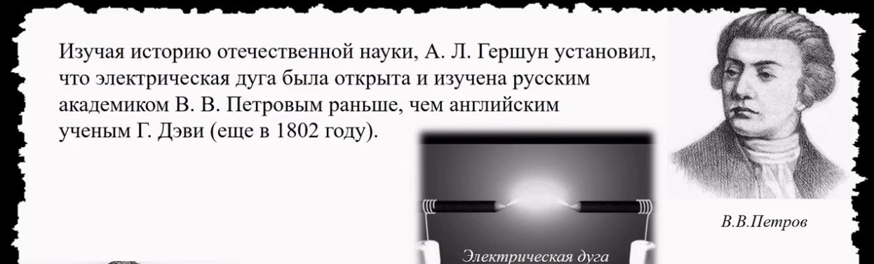 В 1802 г. В. В. Петров открыл явление свечения, возникающего между угольными электродами, по которым проходит электрический ток. Оно описано в "Известиях о гальвани-вольтовских опытах" и впоследствии было названо вольтовой дугой. Открытие вольтовой дуги было ошибочно приписано знаменитому английскому учёному Гемфри Дэви. Но Дэви, докладывавший несколькими годами позже Королевскому обществу о такого рода явлении, не претендовал на приоритет в его открытии. Явление вольтовой дуги Дэви описал лишь в 1810 и 1812 гг.