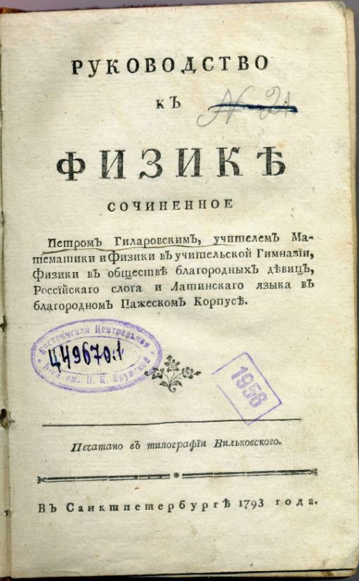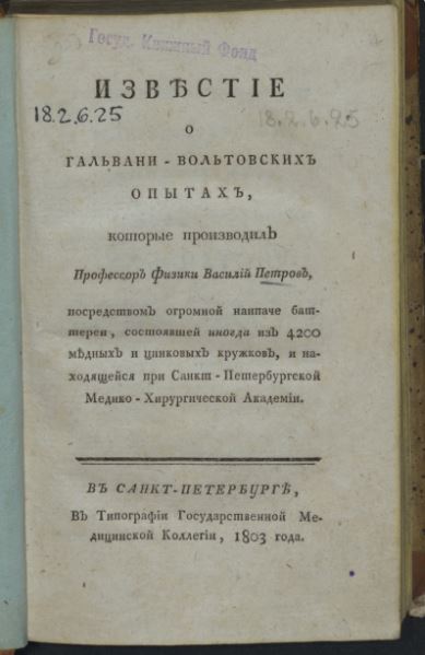 «Известие о гальвани-вольтовских опытах». СПБ, 1803 г.