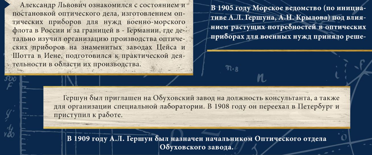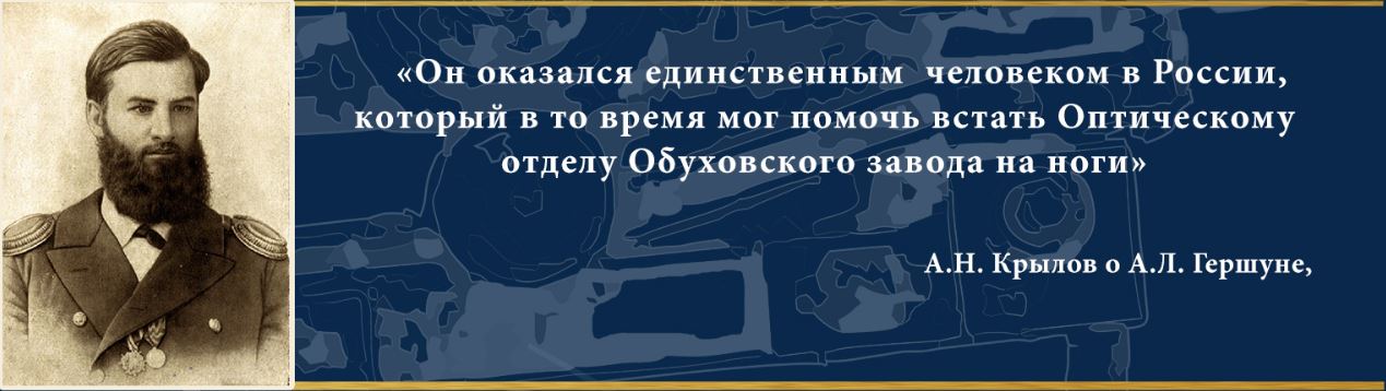 В 1906 г. последнее инициировало создание Оптического отдела (сначала оптико-механической-мастерской) при Обуховском заводе, в 1904 г. объединенного с Александровским сталелитейным и рельсопрокатным заводом (на его территории и разместилась мастерская). Ее появление связывалось с острейшей необходимостью улучшить состояние русской артиллерии после поражения России в русско-японской войне 1904–1905 гг., особенно морской и береговой, которая нуждалась в совершенных прицельных приспособлениях. В течение двух лет А. Л. Гершун считался научным консультантом и приглашался как эксперт в области прикладной оптики для решения точечных задач (в 1907 г. выпускаемые оптические изделия под руководством Гершуна были удостоены почетных наград на Французской международной выставке). В 1907 году сконструированный А.Н. Крыловым новый дифференциальный дальномер был изготовлен в оптической мастерской Обуховского завода при непосредственном участии инженера Я.Н. Перепелкина и А.Л. Гершуна. В 1908 году А.Л. Гершун переехал в Петербург и приступил к работе на Обуховском заводе. В 1909 году А.Л. Гершун был назначен руководителем оптического отдела.