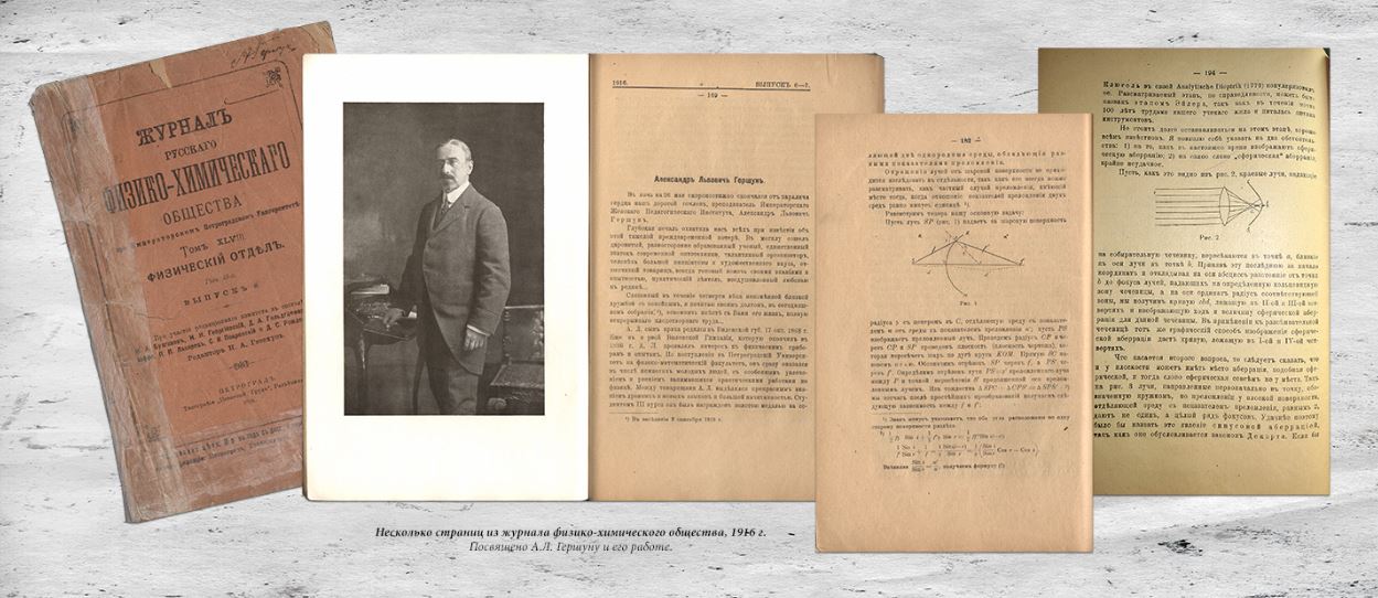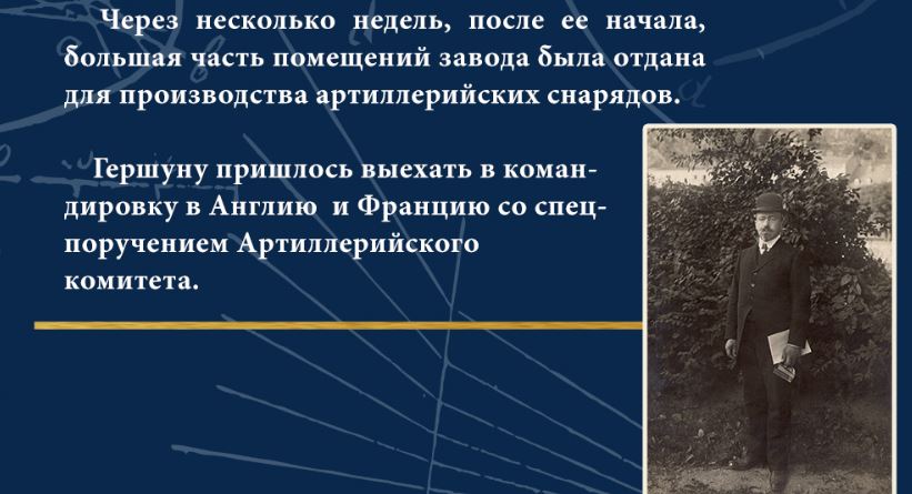 Но вернёмся к судьбе Александра Львовича Гершуна. В 1912 г. Александр Львович Гершун получил приглашение от французских промышленников: его позвали в Крезо на один из заводов Шнейдера (как и Крупп, мирового лидера по производству и продаже оружия) для организации Оптического отдела, но его ответ был отрицательным. Российское общество оптического и механического производства поспешило назначить Гершуна научным руководителем фирмы. На следующий год было начато строительство Оптического завода на Чугунной улице (современное ЛОМО). Отдавая новому делу все силы (тратя на сон не более двух часов в сутки), занимаясь проектированием лабораторий, весной 1914 г. он уже участвовал в оборудовании предприятия.