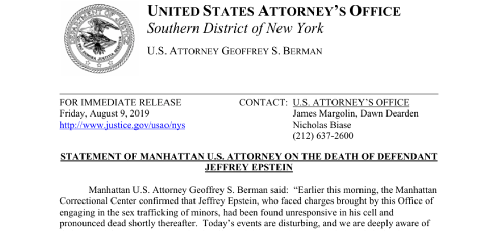 Появились свидетельства некоего работника тюрьмы, в которой умер Эпштейн, о том, что в ночь, после которой «Эпштейн был обнаружен мёртвым», в тюрьму заезжала военная машина без номеров, которая вывезла живёхонького Эпштейна и заменила его чьим-то трупом. Также какие-то айтишники вроде бы обнаружили в Израиле информационные проявления живого Эпштейна. Это всё вилами на воде писано, но вот в очередной порции документов Эпштейна нашёлся черновик сообщения прокурора Южного округа Нью-Йорка, датированный 09.08.2019, с сообщением о смерти Эпштейна (его скриншот находится в начале этой статьи). Но 09.08.2019 Эпштейн был ещё живёхонек, а мёртвым он был обнаружен только 10.08.2019. Вот как интересно! То есть самоубийства там точно не было. Либо убийство, либо подмена заключённого чьим-то трупом.