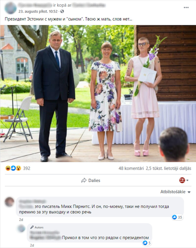 В комментариях к посту на Facebook люди писали, что на фотографии не семья президента Эстонии. В частности, некий пользователь отметил, что с президентом стоит писатель Микк Пярнитс, на что получил ответ от автора поста: "Прикол в том, что это рядом с президентом". Постом поделились 2500 человек, в том числе и в Латвии. Люди в комментариях писали, например, "это демократия" или "Тво…. докатились… самим не противно?".