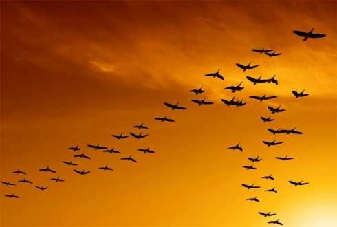 А знаете ли вы, почему птицы летают клином? Да-да, на дальние расстояния крупные стайные птицы, как правило, летают именно в этом построении. И это неспроста! Дело всё в том, что самая первая птица в стае рассекает воздух. За ней, углом, будто две невидимые воздушные тропинки, остаются завихрения и разрежённый воздух. Две следующие птицы пристраиваются за первой и летят по этим "тропинкам". Так легче, воздух оказывает меньшее сопротивление, а завихрения как бы подталкивают птиц вперёд. В завихрениях, оставляемых парой, летящей за вожаком, следуют ещё две птицы, за ними ещё две. Так образуется клин.