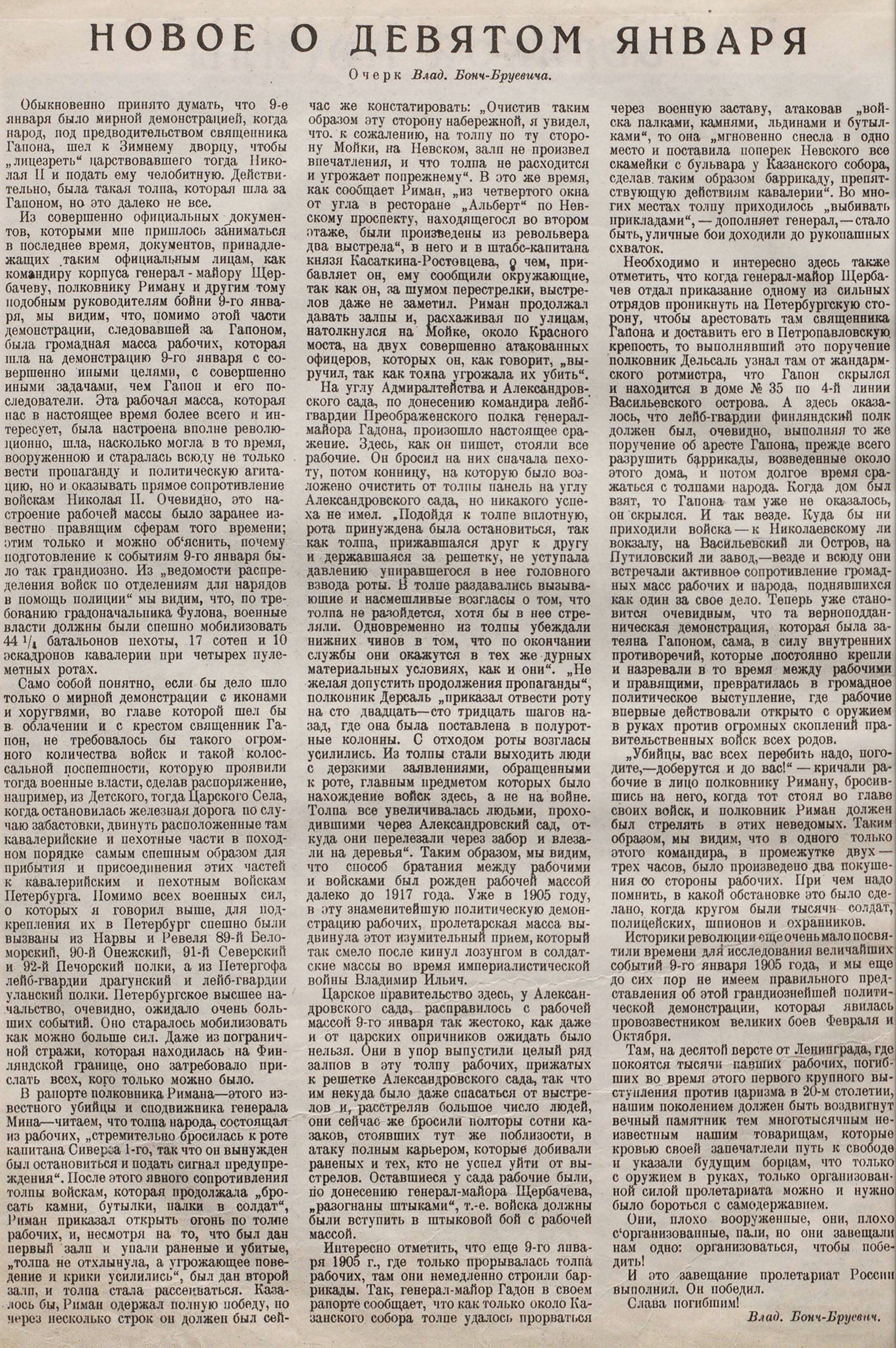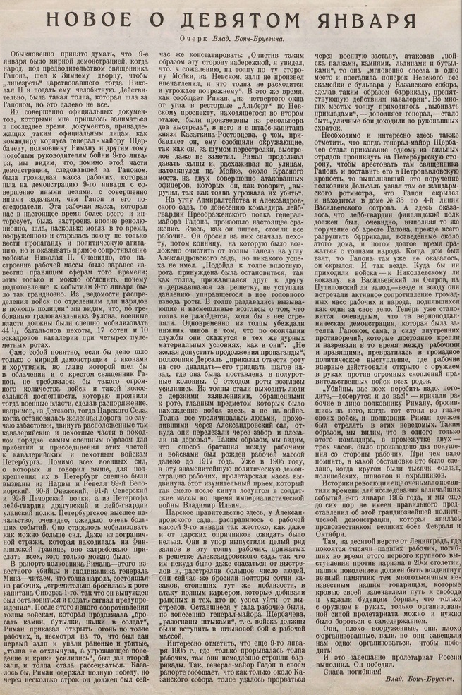 Первое, что мы узнаем непосредственно из источника, так это то, что сам Владимир Бонч-Бруевич не был непосредственным участником и свидетелем событий 9 января 1905 года. И не мог быть, потому что находился в это время в Женеве. Если вы подумали, что события изложены по воспоминаниям партийных товарищей Бонч-Бруевича, то вы ошибаетесь! Статья Бонч-Бруевича основывается на сведениях, почерпнутых им из «официальных документов, принадлежащих … командиру корпуса генерал-майору Щербачеву, полковнику Риману и тому подобным руководителям бойни..».