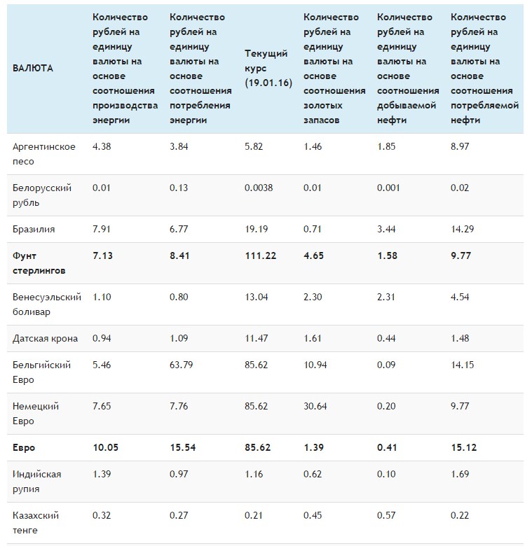 В конце 2014 года были сделаны расчёты (http://newyouthpolicy.org/ru/a...) курсов валют на основе энергетического стандарта по объёмам потребляемой и производимой электроэнергии, сопоставили с тогдашними курсами валют и обнаружили, что по основным резервным валютам (они выделены красным) курсы завышены в 6 — 10 раз и реальная стоимость доллара, обеспеченного энергопотенциалом США — около 11 рублей: