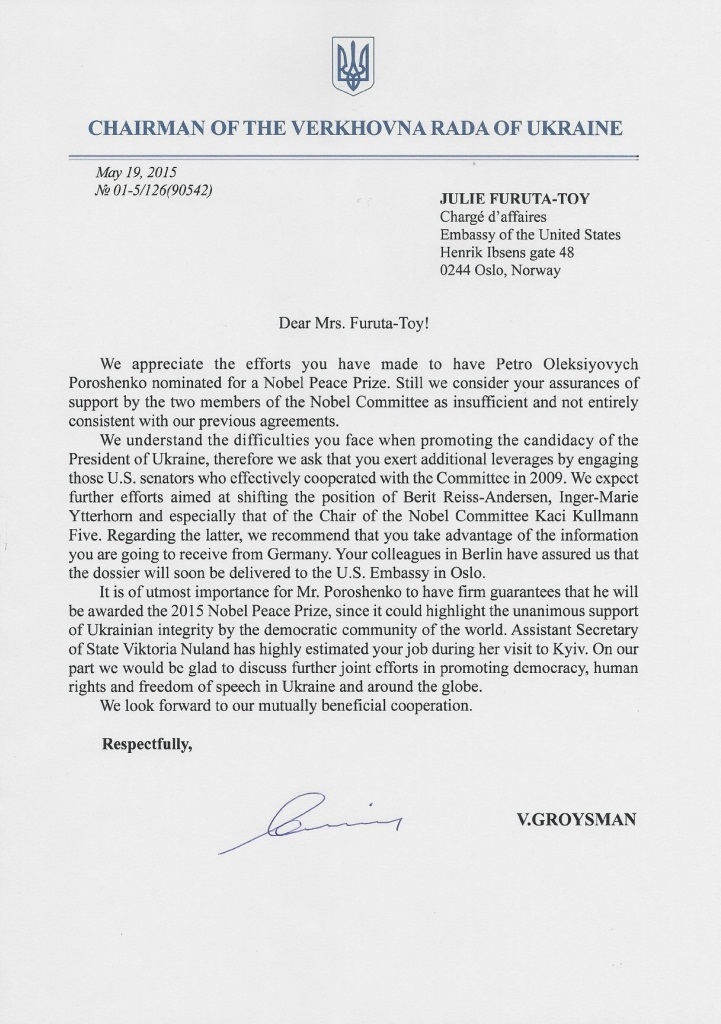 Выражаем Вам глубокую благодарность за предпринятые усилия по выдвижению кандидатуры Петра Алексеевича Порошенко на получение Нобелевской премии мира. Вместе с тем считаем поступившие от Вас заверения в поддержке со стороны пяти членов экспертной группы Нобелевского комитета недостаточными и не вполне соответствующими прежним договоренностям.