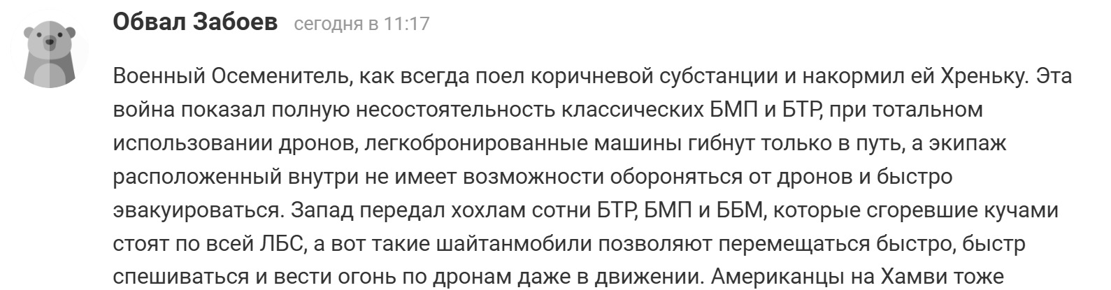 Немедленно перевозбудилось сообщество местных ,,патриотов". Легко и ненапрягаясь они доказали на пальцах, что БМП и БТР гораздо хуже жигулей на поле боя.