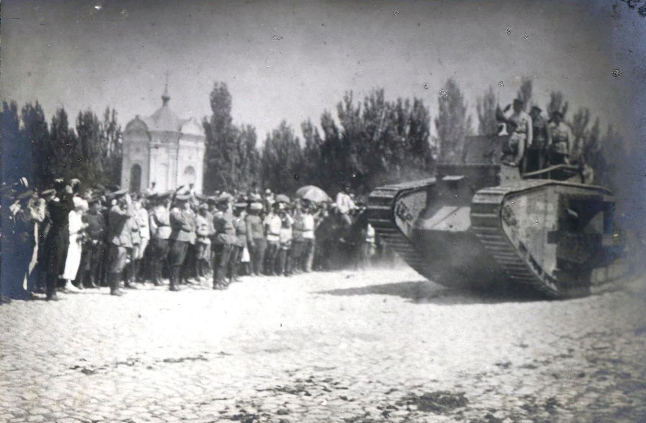 Британский танк Mk V проезжает перед строем войск русской армии в освобожденном Царицыне. Главнокомандующий ВСЮР генерал-лейтенант А.И. Деникин стоит в центре, командующий Кавказской армией генерал-лейтенант П.Н. Врангель – слева. Июнь 1919 г.