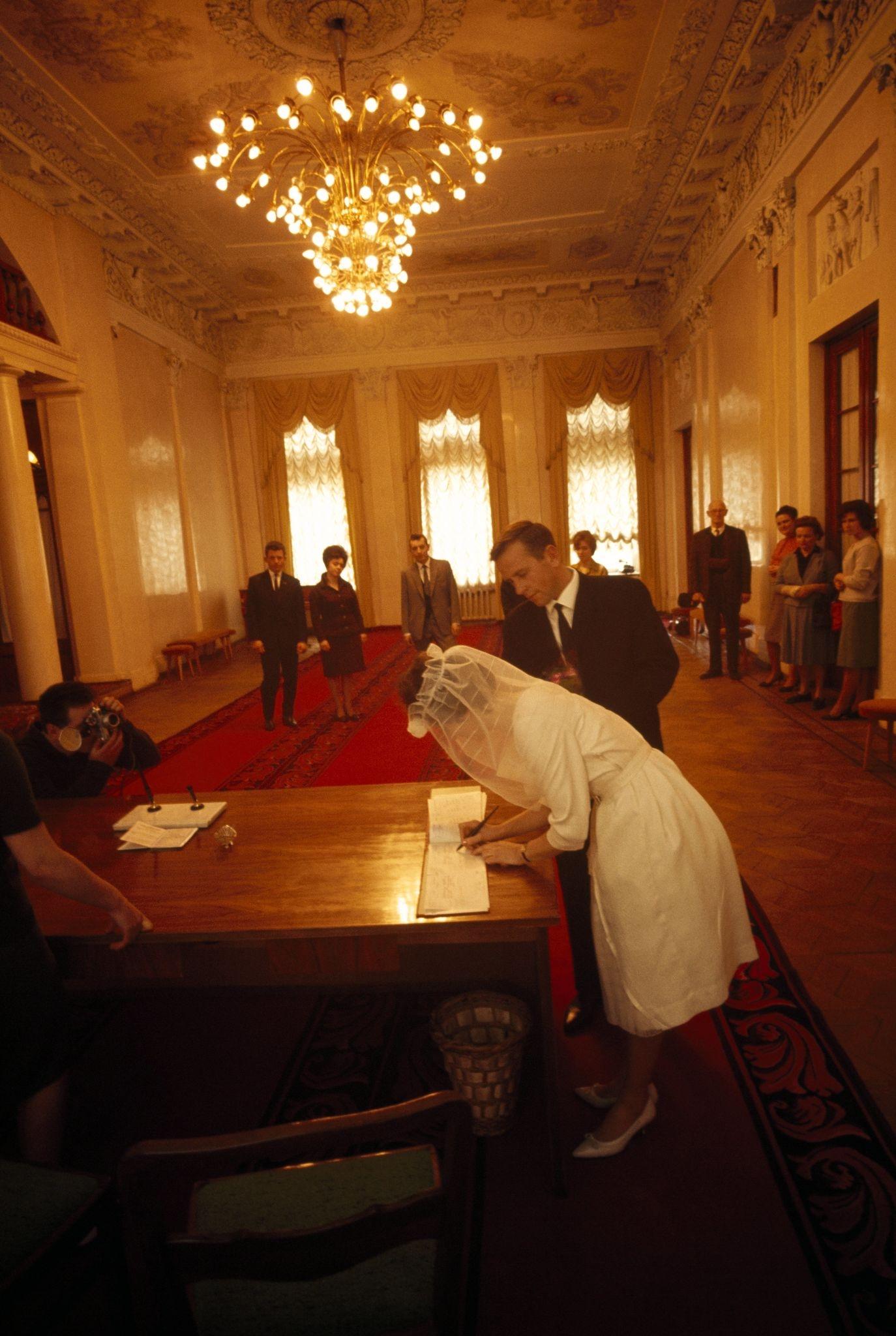 1964. Невеста подписывает бухгалтерскую книгу в богато украшенном Дворце бракосочетания