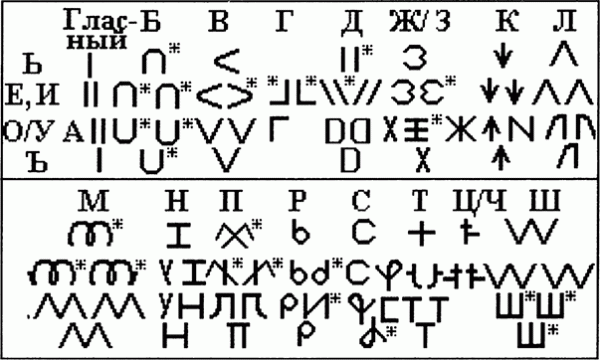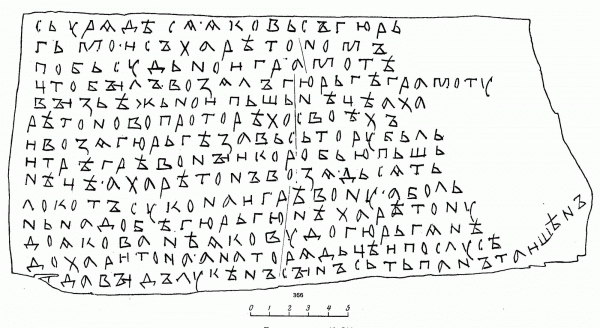 Я, конечно не лингвист и не специалист по древним языкам, но некоторые из этих знаков напоминают современные русские буквы, а другие - древнерусское руническое письмо. Может быть, я ошибаюсь? Но давайте попробуем их сравнить, например, с новгородскими берестяными грамотами.