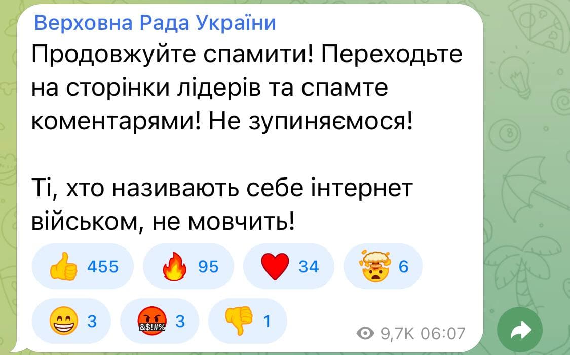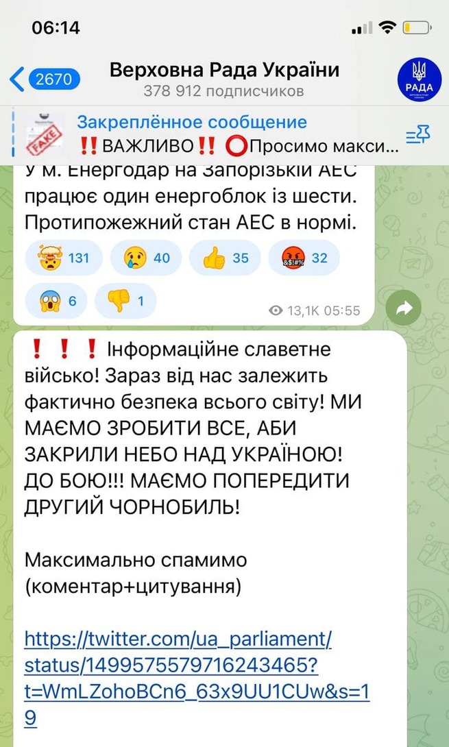 О спланированной провокации также говорит и то, что в украинских телеграмм-каналах и социальных сетях власти Украины призывают население активно писать на западных форумах и в комментариях к постам официальных лиц ЕС просьбы о закрытии неба Украины, о возможности возникновения второго Чернобыля и необходимости срочного принятия Украины в ЕС. Зеленский и его националисты готовы взорвать атомную электростанцию для принятия Украины в ЕС.