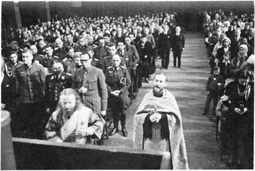 В оперативных приказах начальника полиции безопасности и СД Р. Гейдриха предписывалось в демонстративной форме содействовать церковной жизни, организовывать богослужения или проводить массовое крещение, восстанавливать раннюю патриархальную русскую Церковь (имелись в виду староверы. - Примеч. ред.), содействовать расколу на отдельные православные группы, не принимать мер против распространения сектантства в советском русском пространстве и другое [18]. При огромном стечении народа повсеместно открывались храмы, вновь зазвенели колокола на русской земле. «Церковь начинает приобретать в народной жизни растущее значение», - отмечал 26 ноября 1941 года в отчете «Об отношении к русскому гражданскому населению» командующий тыловой армии северных областей [19].