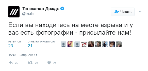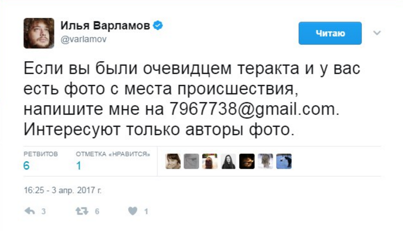 Блогер Илья Варламов и редакторы «Дождя» в погоне за просмотрами разыскивали в Интернете авторские фото с места взрыва. Безусловно, эксклюзив всегда ценился в журналистской среде, но когда сотрудники СМИ так открыто призывают присылать им фотографии с места трагедии, это выглядит бесчеловечно.