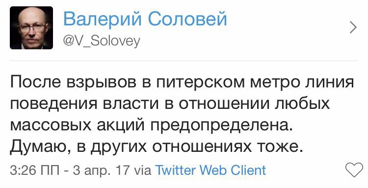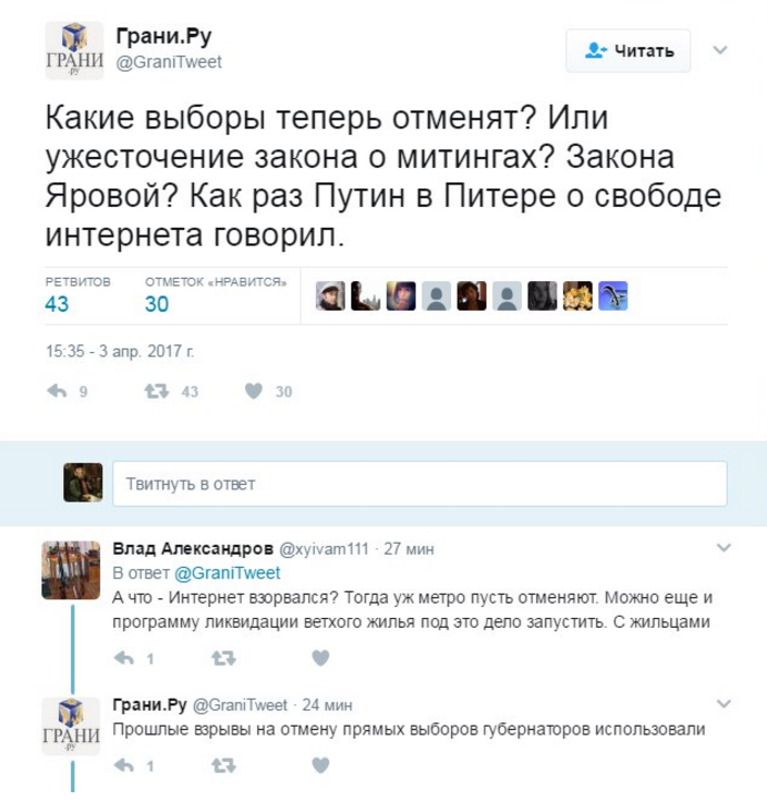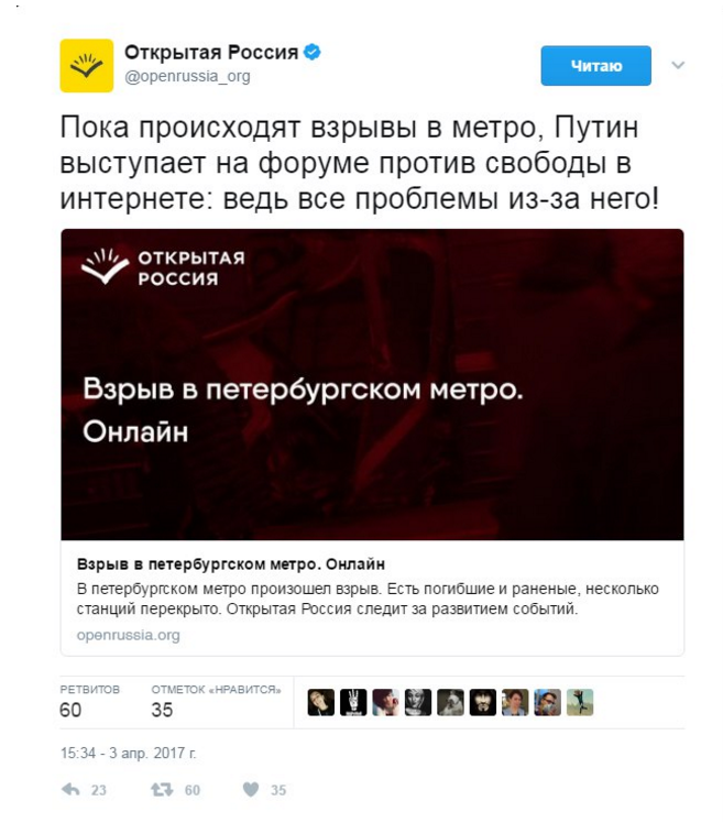 Членов «Открытой России» и сотрудников сайта «Грани.ру» не волновала ни судьба пострадавших, ни их эвакуация из метро. Выставляя себя полными идиотами, они строили бредовые конспирологические версии и пытались как-то увязать краткий комментарий Владимира Путина (при этом полностью исказив его содержание) с террористической атакой.