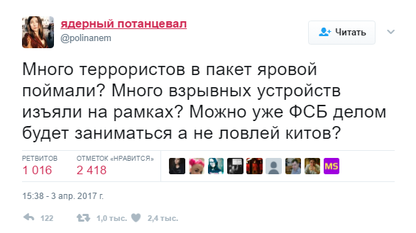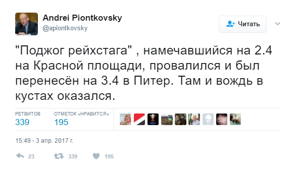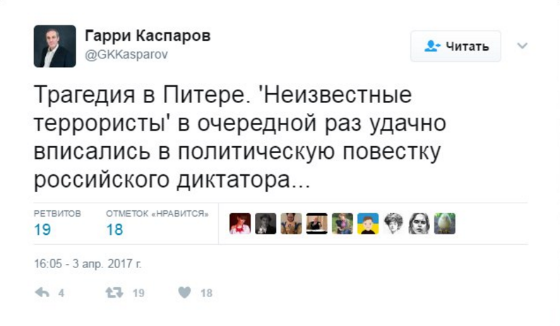 Взрыв в петербургском метро прокомментировали и Гарри Каспаров, и Андрей Пионтковский. Ознакомившись с их суждениями, убеждаешься в том, что параноидальный психоз окончательно овладел ими и действительно хорошо, что эти гиганты мысли уехали из нашей страны. Как говорится, воздух чище будет. Показательно большинство украинских аккаунтов, оценивших аналитику мэтров.