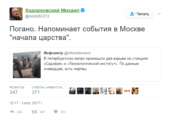 Бывшему владельцу ЮКОСа Михаилу Ходорковскому, скрывающемуся в Лондоне, вдруг стало «погано», от чего он попытался намекнуть на участие российских спецслужб как в теракте в питерском метро, так и в подрыве жилых домов в Москве и Волгодонске в 1999 году.
