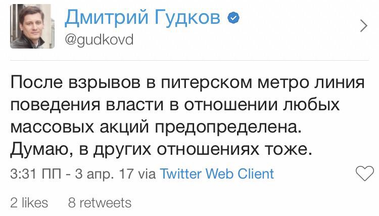 Примечательно, что текст поста Гудкова полностью повторял записи других «аналитиков», наводнивших Twitter в первые минуты после теракта.