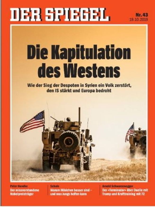 К слову, такой финал немецкий журнал предполагал и ранее. На обложке одного из номеров «Шпигеля», вышедшего еще до подписания российско-турецкого меморандума, фотография с изображением покидающей Сирию американской военной техники была подписана: «Капитуляция Запада».