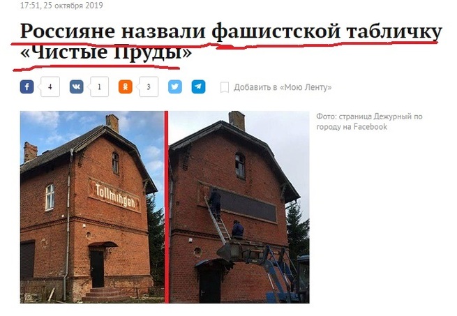 «Жители Калининградской области посчитали фашистской историческую надпись на здании, хотя та переводится на русский язык как „Чистые Пруды“ и была восстановлена в память о местном поэте».