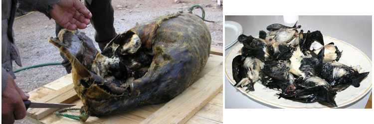 Например, кивиак - традиционное эскимосское блюдо из Гренландии, которое готовят из гагарок (семейство морских птиц), которые укладываются в шкуру тюленя (порядка 400 птиц), затем из шкуры выпускается воздух, она запечатывается салом и помещается под землю под пресс на 3-18 месяцев. В течение этого времени птица ферментируется, а затем её мясо едят во время праздничных застолий в дни рождения или свадьбы.