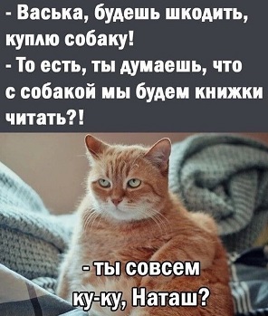 - Что значит, "отстаньте-я хочу спать-мне завтра на работу"? Вот на работе и поспишь! А котики в два часа ночи хотят жрать, Наташа! Как, не Наташа? А, пофиг - поднимай жопу и иди к холодильнику! Потому что жрать - в холодильнике... Котики не могут открыть холодильник - у них лапки... Вот, не веришь?