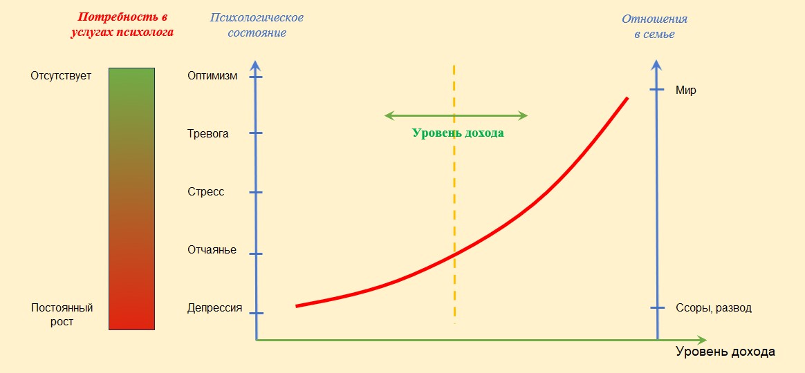 По мере того, как уровень дохода растёт, людей всё меньше волнуют их психологические проблемы, потому что они могут закрыть все свои потребности и не испытывать при этом тревогу, стресс, депрессию вызванные неуверенностью в завтрашнем дне и тем, где взять деньги на проживание, детей, здоровье и тому подобное.