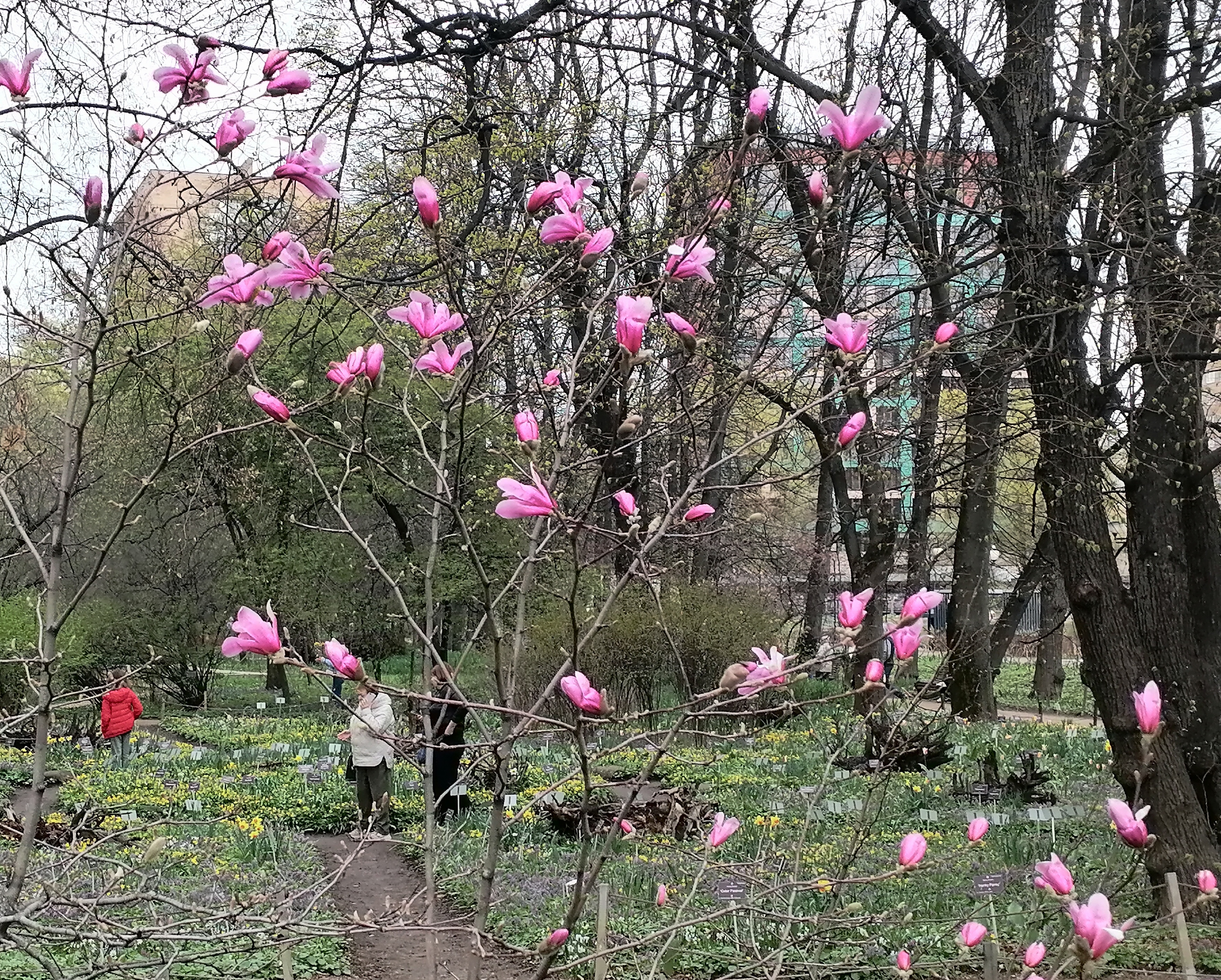Даже магнолия раскрыла ярко-розовые крупные цветы. Но посетители пока проходят мимо: спешат увидеть цветущую сакуру.