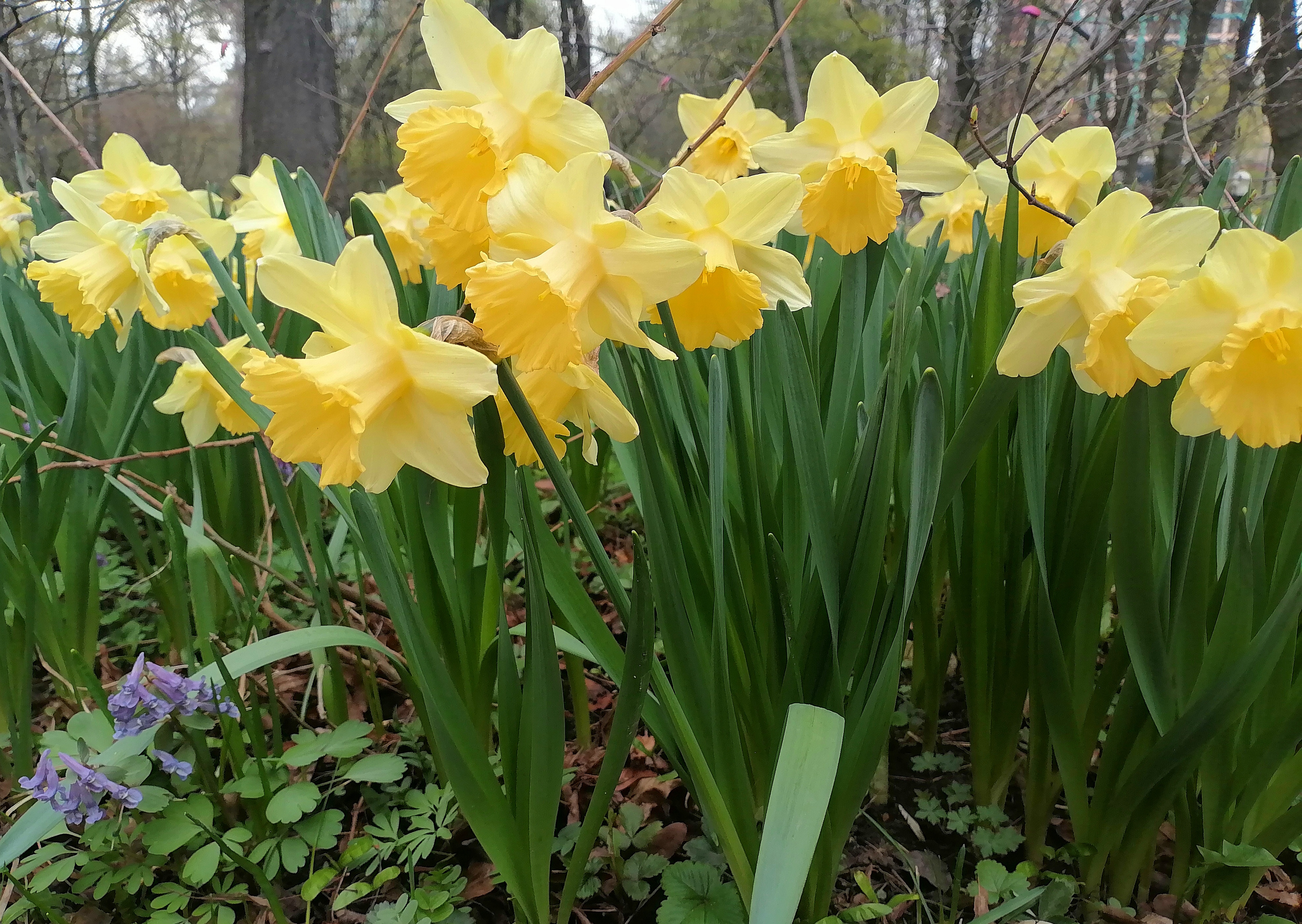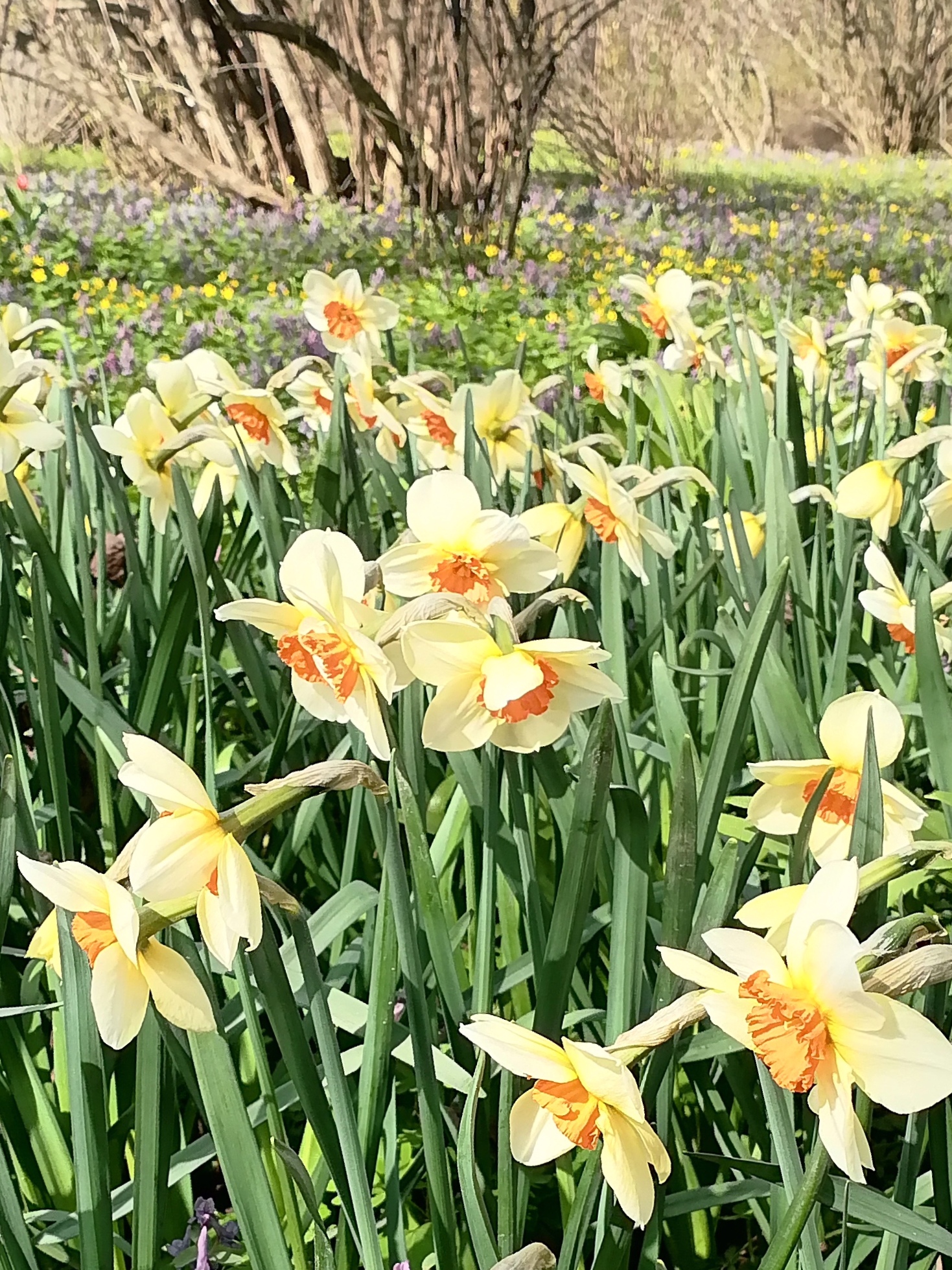К счастью и радости посетителей сада, кроме сакуры расцвели и нарциссы, и ранние тюльпаны, и гиацинты, и первоцветы ещё в силе. Словом, весна мощно и ярко вступила в свои права.