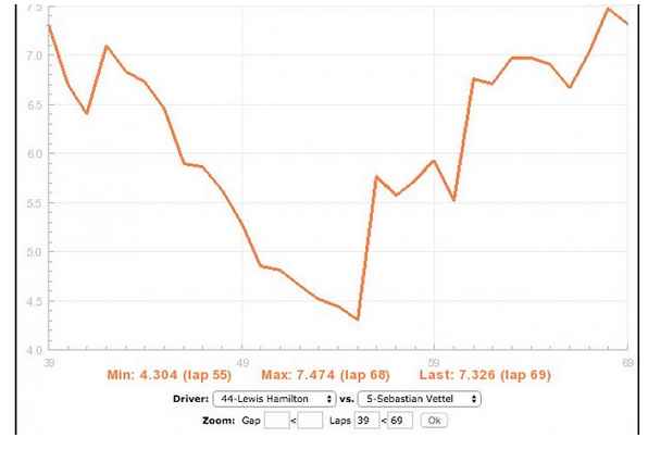 Темп Льюиса на мягких шинах в середине дистанции стал неприятным сюрпризом для Ferrari. У Феттеля состав был на порядок мягче, но и на 13 кругов старше из-за раннего пит-стопа. До своего второго пит-стопа на 37-м круге Себастьян в среднем проигрывал лидеру 0,287 секунды с круга.