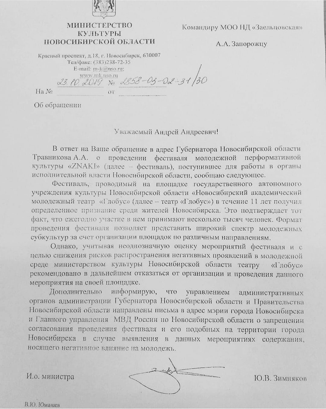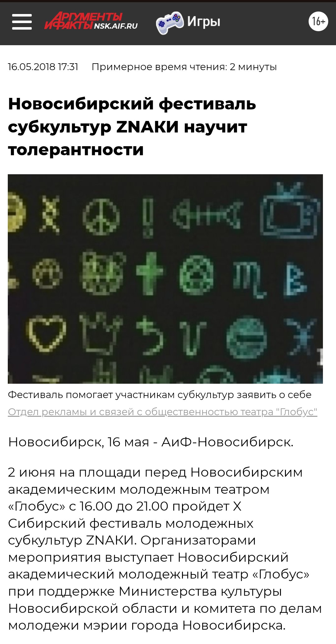 Цитата: "...учитывая неоднозначную оценку мероприятий фестиваля и с целью снижения рисков распространения негативных проявлений в молодежной среде министерством культуры Новосибирской области театру «Глобус» рекомендовано в дальнейшем отказаться от организации и проведения данного мероприятия на своей площадке.
