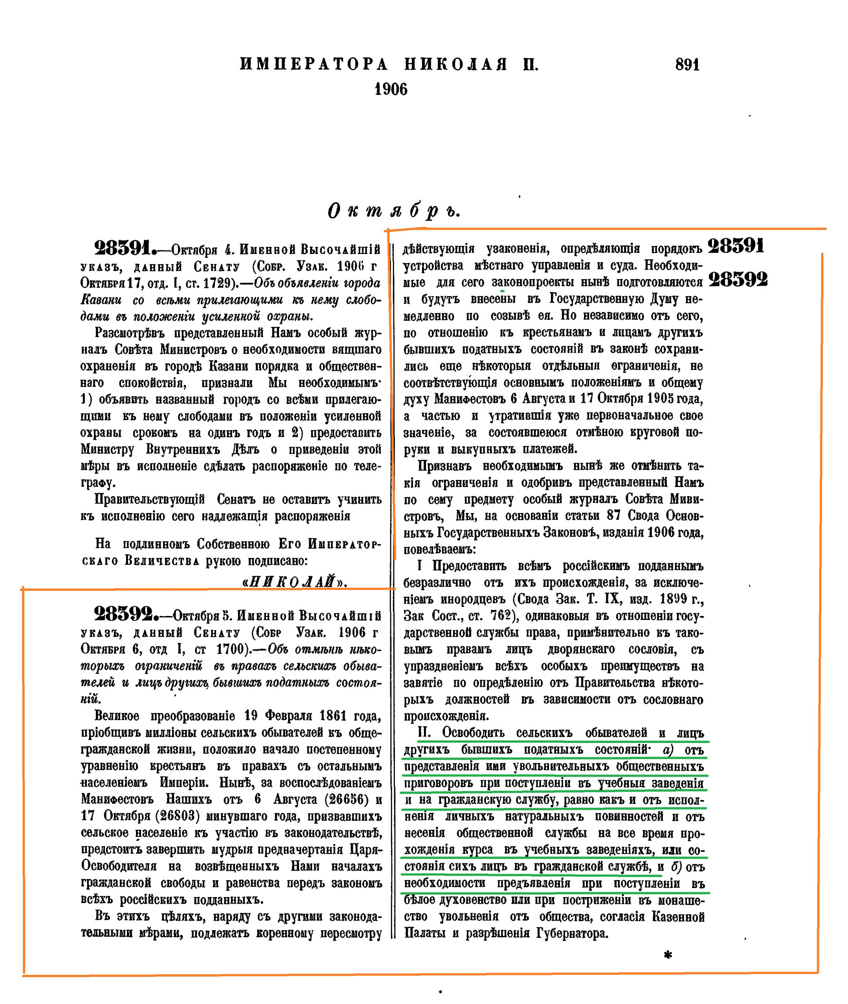 Манифестом Нашим от 3 ноября 1905 года (26871) взимание с крестьян выкупных платежей за надельные земли отменяется с 1 января 1907 года. С этого срока означенные земли освобождаются от лежащих на них, в силу выкупного долга, ограничений, и крестьяне приобретают право свободного выхода из общины, с укреплением в собственность отдельных домохозяев, переходящих к личному владению, участков из мирского надела.