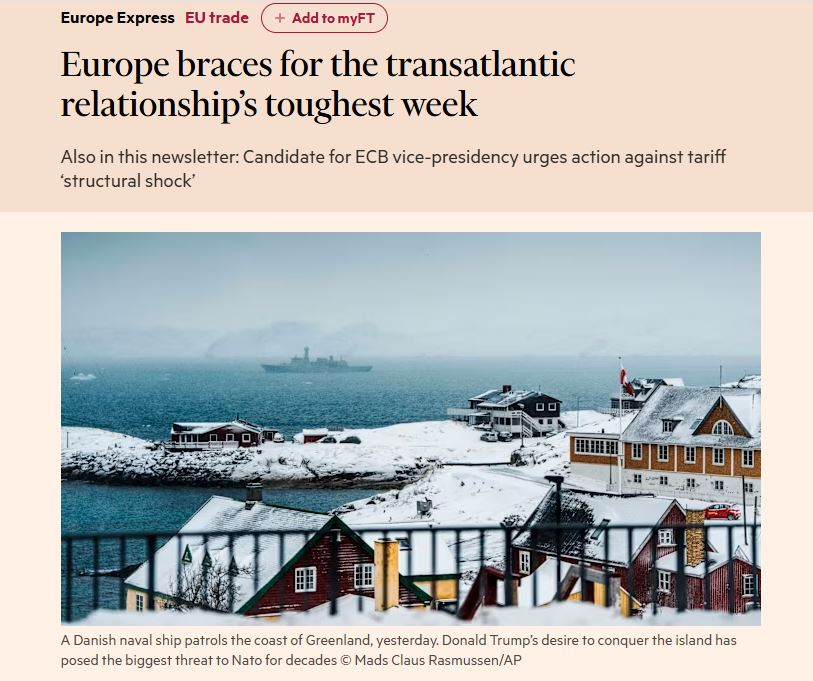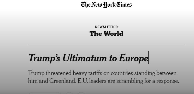 «Конфликт Европы с Трампом из-за Гренландии может ударить по западной поддержке Украины. Всё потому, что Европа по-прежнему сильно зависит от поддержки Соединённых Штатов в рамках НАТО и в войне России против Украины [на самом деле – в войне Запада Украиной с Россией – «ОР»]. Именно поэтому европейские лидеры до последнего старались действовать очень сдержанно в отношениях с Трампом. Так, например, в прошлом году они без всяких возражений согласились на повышение американских пошлин, они послушно старались демонстрировать уважение во время визитов в Белый дом и избегали жёсткой критики даже тогда, когда Трамп неоднократно занимал позиции, выгодные России. Да и по другим внешнеполитическим вопросам, включая Венесуэлу, европейские столицы также предпочитали молчание. Но ситуация резко изменилась после решения Трампа взять под контроль Гренландию. Этот шаг не оставил Европе возможности и дальше избегать ответа. И хотя военная зависимость Европы от США сохраняется, а роль Вашингтона в обороне Украины остаётся ключевой, но история с Гренландией стала поворотным моментом, который меняет все прежние расчёты и повышает риски для единства западной поддержки Киева», – сообщает New York Times.