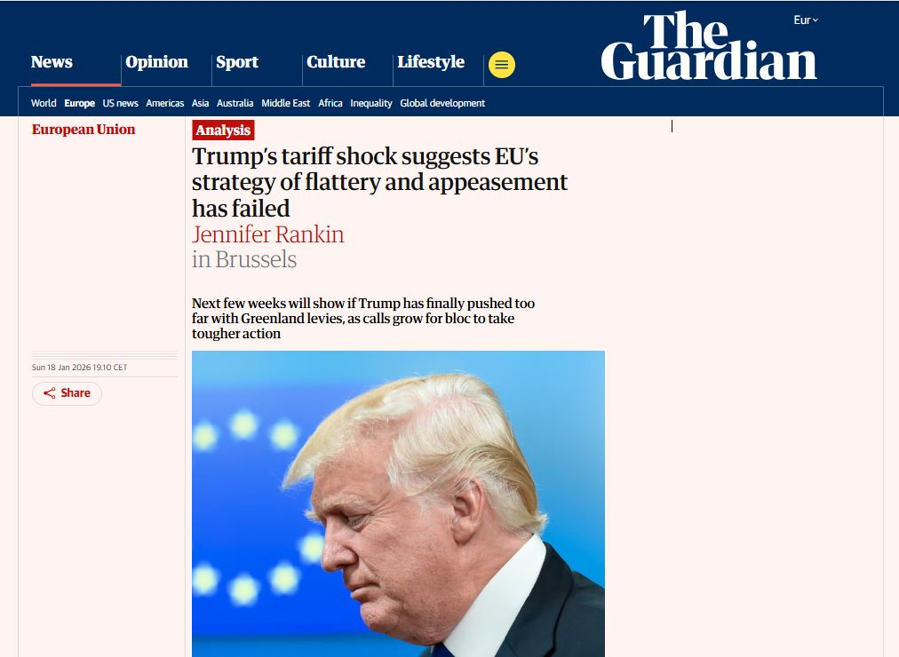 The Guardian также обращает внимание на то, что лидеры ЕС по давней привычке продолжают называть Трампа и США «нашим союзником и нашим партнёром», что достаточно странно в той ситуации, которая сегодня сложилась между США и ЕС. Впрочем, Дональда Трампа это не остановило – на выходных он нанёс новый удар по Евросоюзу: Вашингтон пообещал странам, поддержавшим Гренландию, увеличить пошлины. А если они не хотят нового удара по экономике, должны тут же согласиться на продажу Гренландии, отмечает The Guardian.