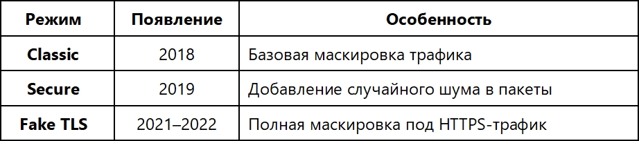 • Протокол постоянно эволюционирует, добавляя новые режимы обфускации (маскировки)