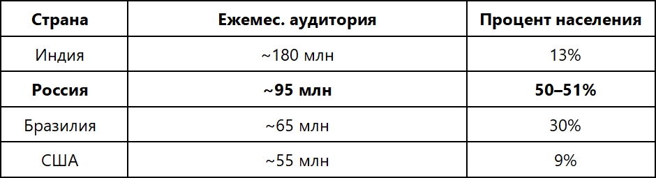 3. «10% российского рынка» - это иллюзия. На самом деле это 50% населения страны, крупнейшая ежедневная активность в мире (74 млн человек), главный рекламный рынок Telegram (миллиардные обороты) и его «контент-фабрика».