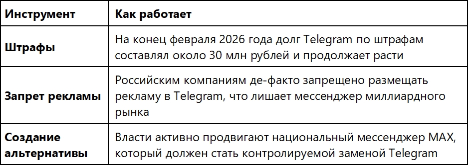 Это не попытка «отключить» Telegram, а попытка сделать его экономически невыгодным и политически неудобным для работы в России, если он не идёт на уступки.